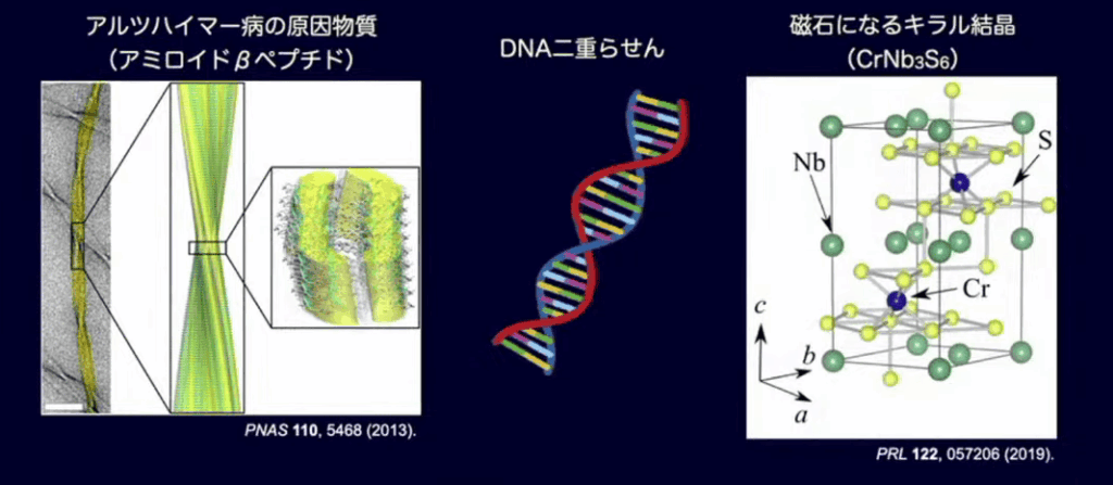 このとき、物質自体が「らせん構造」や「ねじれた構造(キラルな構造)」をしていると、そこから出る光もそのねじれの影響を受けて回転します。