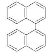 2つのナフタレン環(ベンゼン環が2つ繋がったもの)が、1本の結合(単結合)でつながった構造をしています。この2つのナフタレン環は、お互いの反発を避けるために「ねじれた」位置関係(軸不斉)をとります。このねじれがキラリティの源となり、CPL特性を示します。