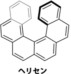 ベンゼン環が「らせん状」につながった分子です。構造自体が非常に強固な「ねじれ」を持っており、CPL研究の初期から代表的な分子として知られています。らせんの巻き方によって右巻き(P体)と左巻き(M体)が存在し、それぞれ逆回転のCPLを示します。