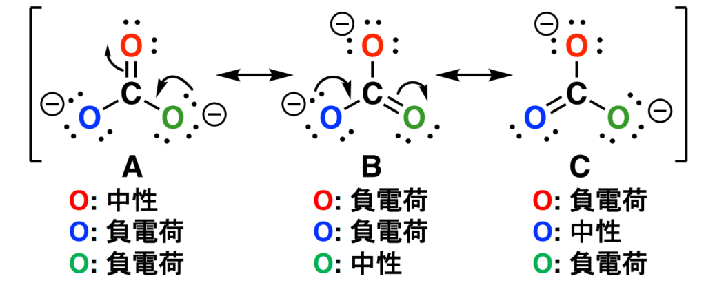 これは当たり前なのですが、共鳴構造式の一つ一つの電荷は一定です。元の電荷がゼロなら、どの共鳴構造式のトータルの電荷はゼロになります。