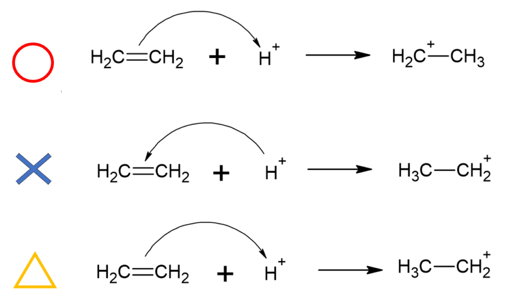 ×「H⁺が、電子豊富な二重結合に近づいていく」 〇「二重結合のπ電子が、H⁺を捕まえにいく」