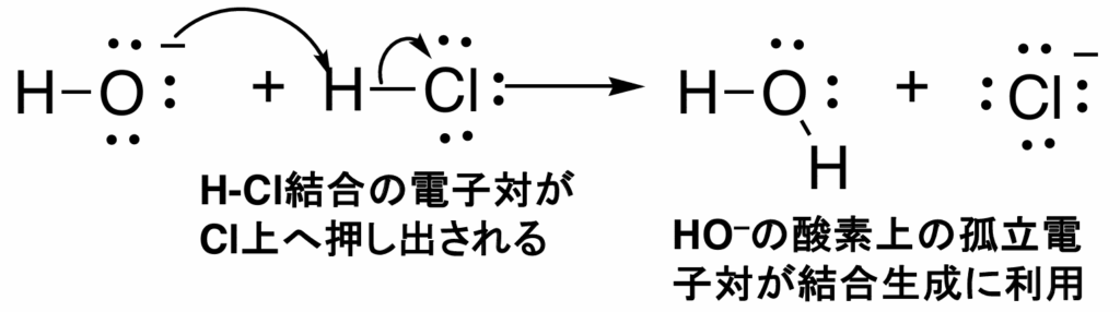 - OH–の非共有電子対(始点)から、HClのH(終点)へ矢印を引く(Hへの攻撃)。