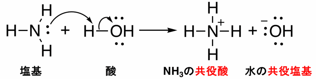 「塩基がH⁺を奪う」反応ですが、H⁺が動くのではなく、塩基の電子対がHを取りに行くように描くのが鉄則です。