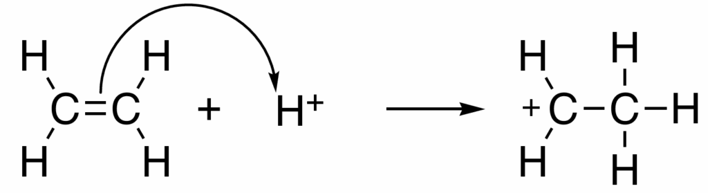 \(\ce{CH2=CH2 + H+ -> CH2+CH3}\)
